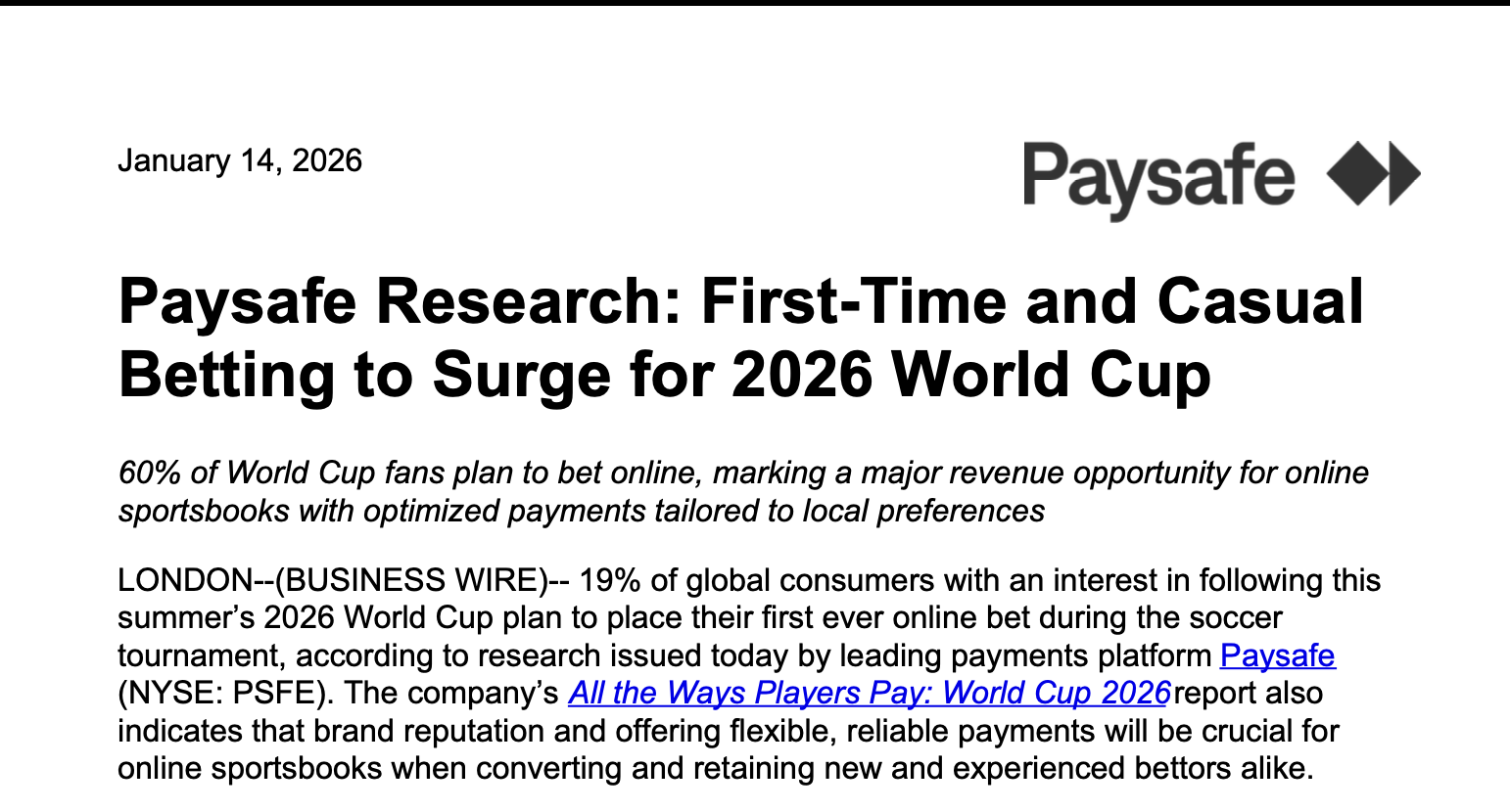 Paysafe: 60% зрителей ЧМ-2026 выберут онлайн-ставки