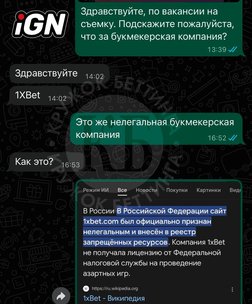 Авторы канала связались с рекрутерами, которые подтвердили, что заказчиком съемок является 1xBet. После замечания о том, что оператор не имеет лицензии в РФ, представители рекрутинга выразили удивление.